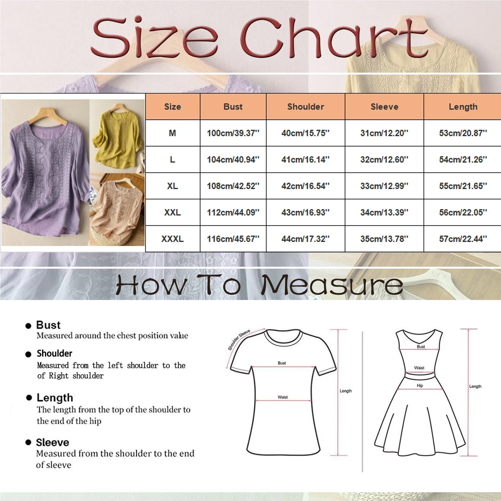 | Size | Bust | Shoulder | Sleeve | Length |